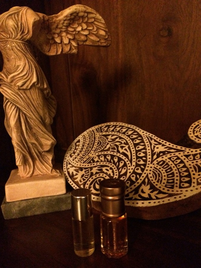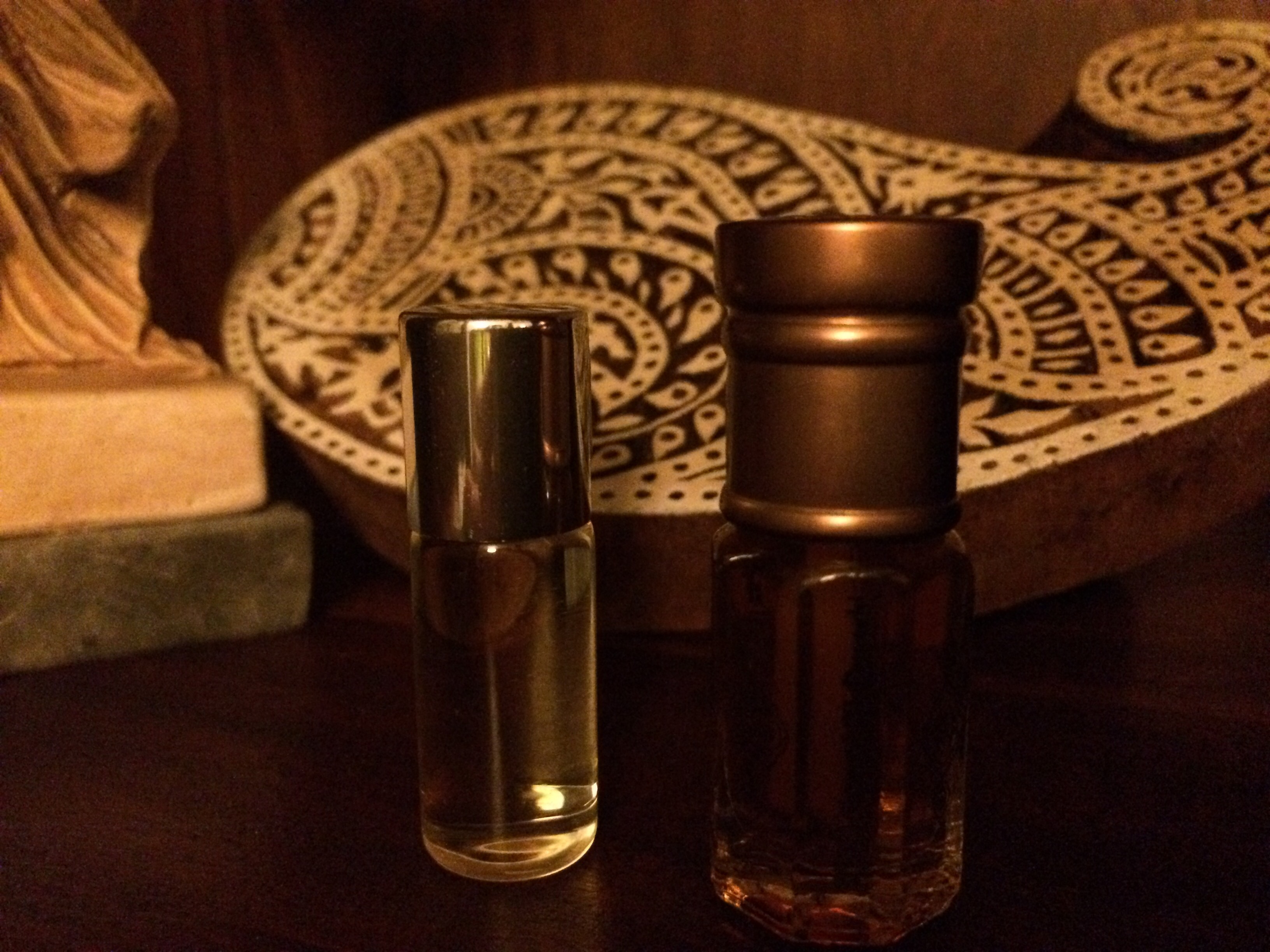 En härlig blandning av ren sandelträ olja från Swiss Arabian (ingen annan doft är så rogivande än denna! Glöm lavendel!), samt två droppar av sötare oud-amber blend av Abdul Samad al Qurashi för lite sensualitet. Snälla, försök att använda oljor av bra kvalitet. Det är faktiskt viktigt att inte använda parfymerade eller syntetiska oljor.