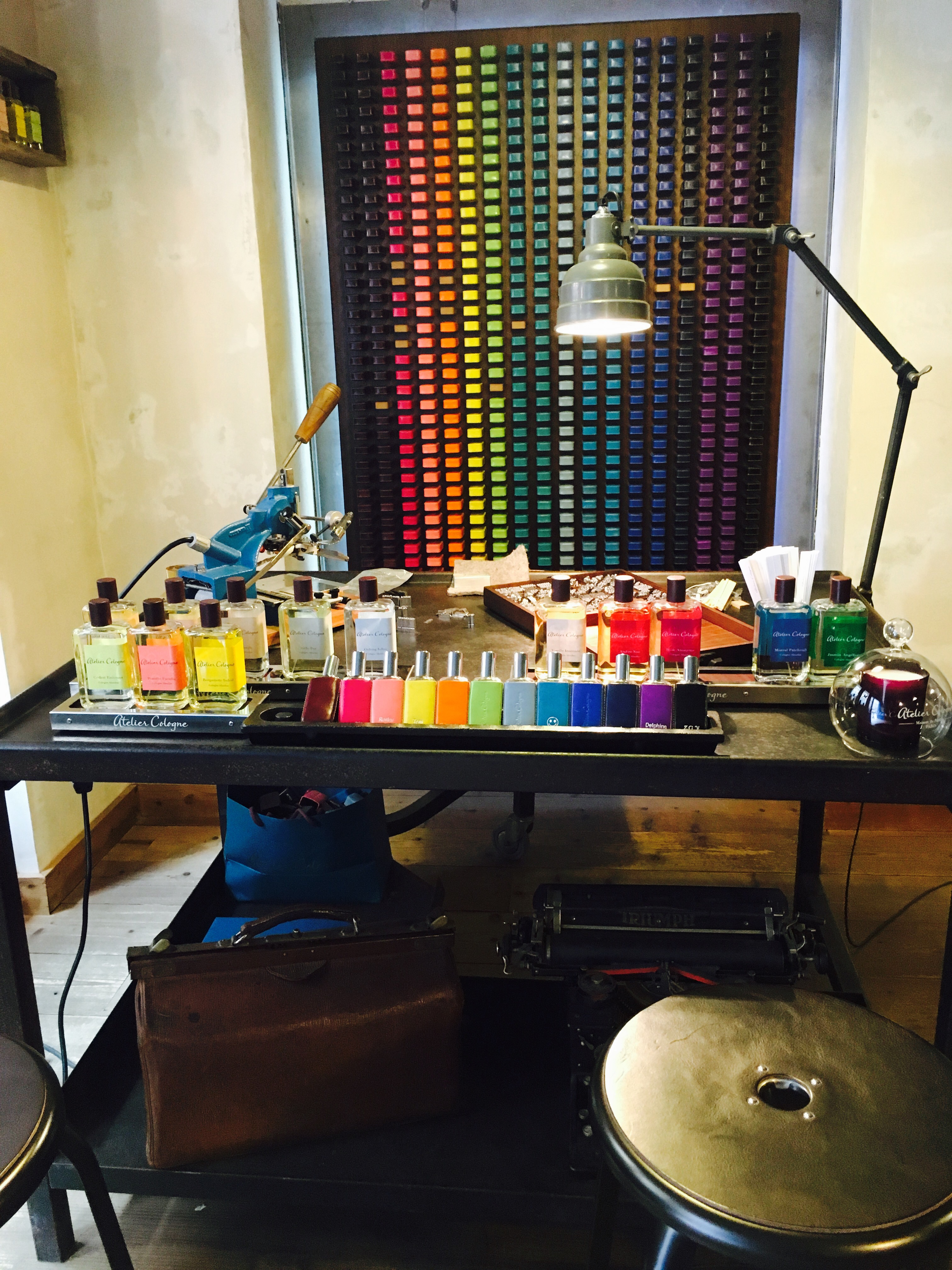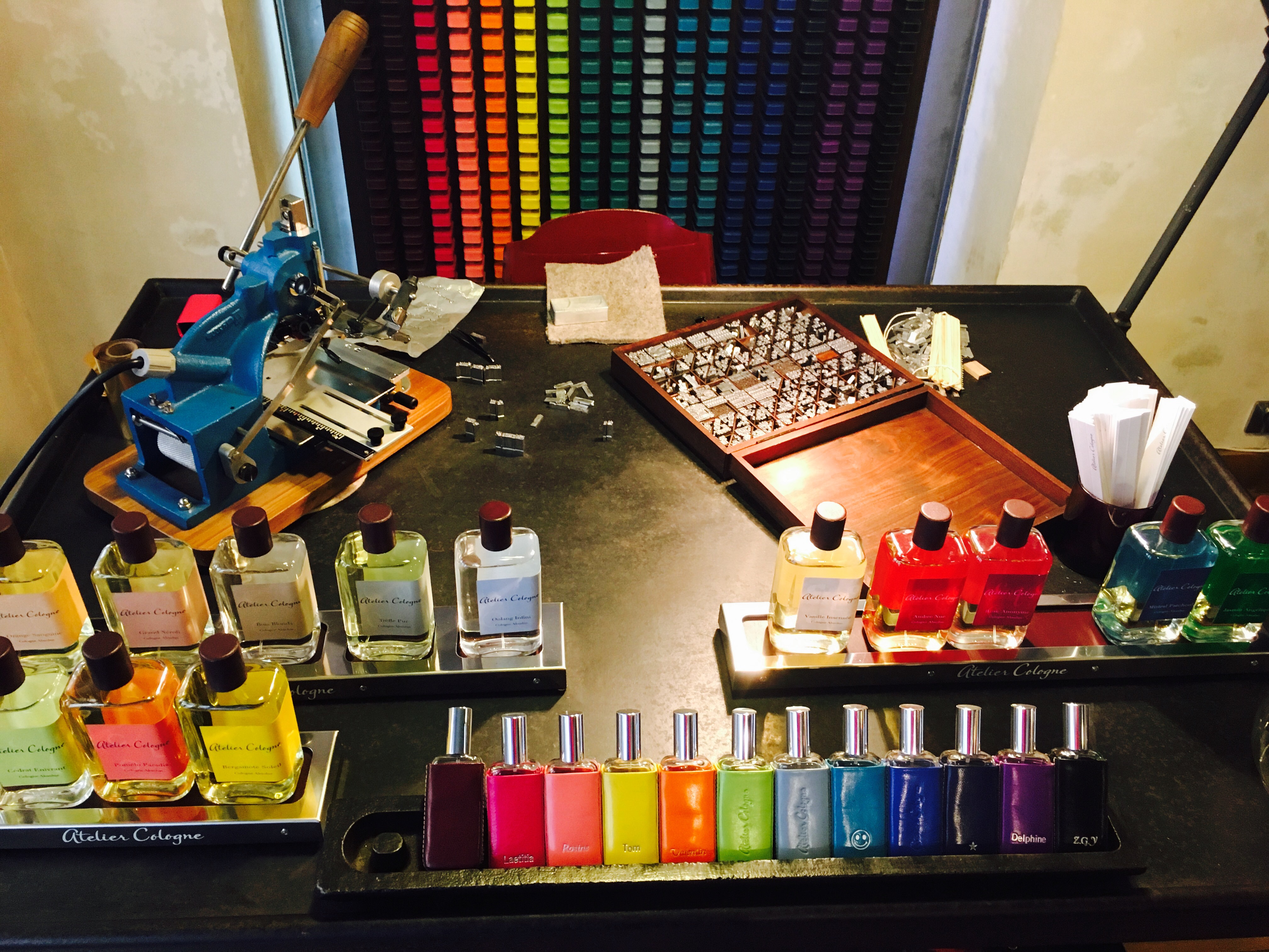 Det här är bara superfint! En liten verkstan där de gör personaliserade läderband till Ateliers flaskor. Färgerna är underbara!