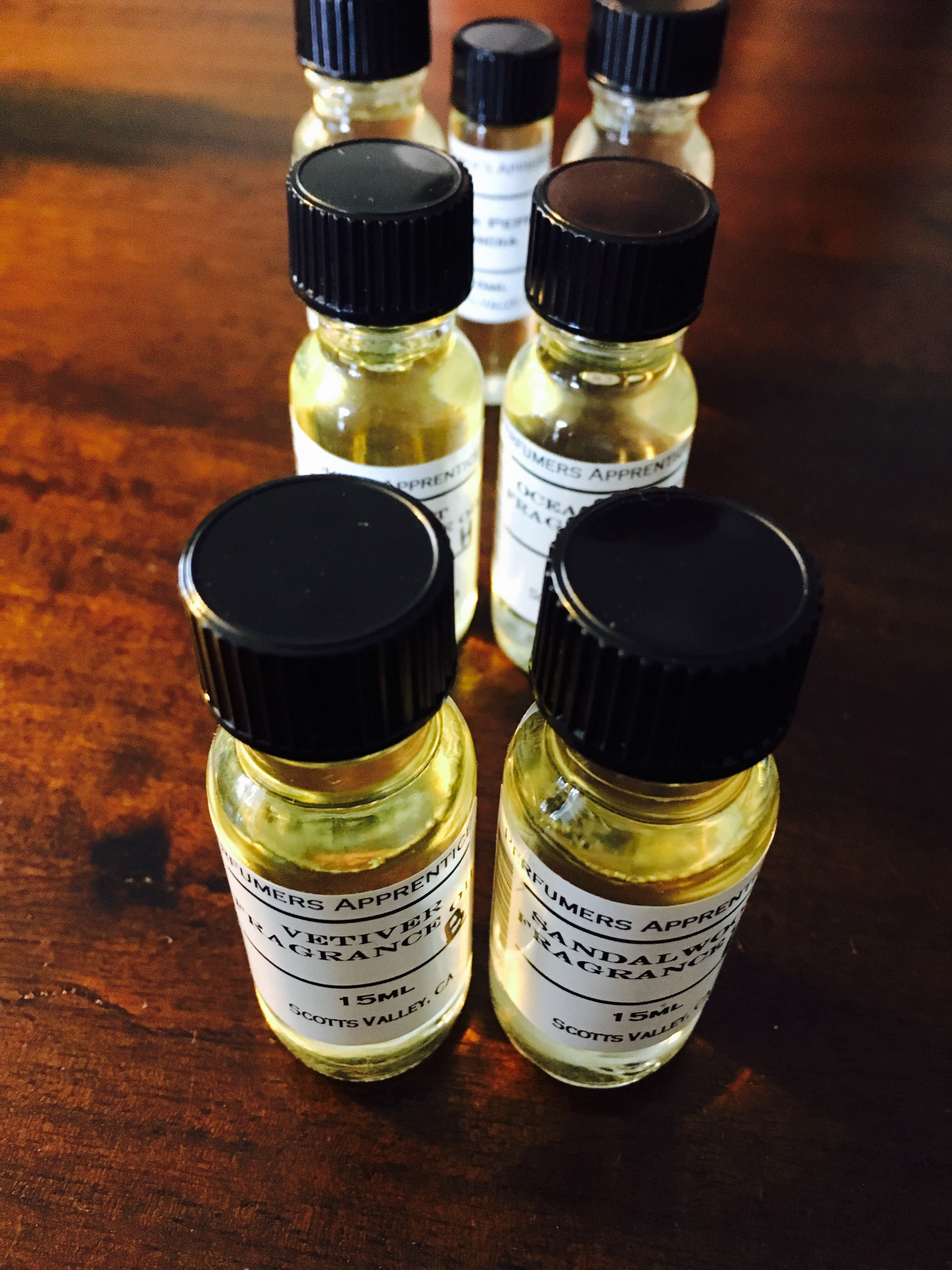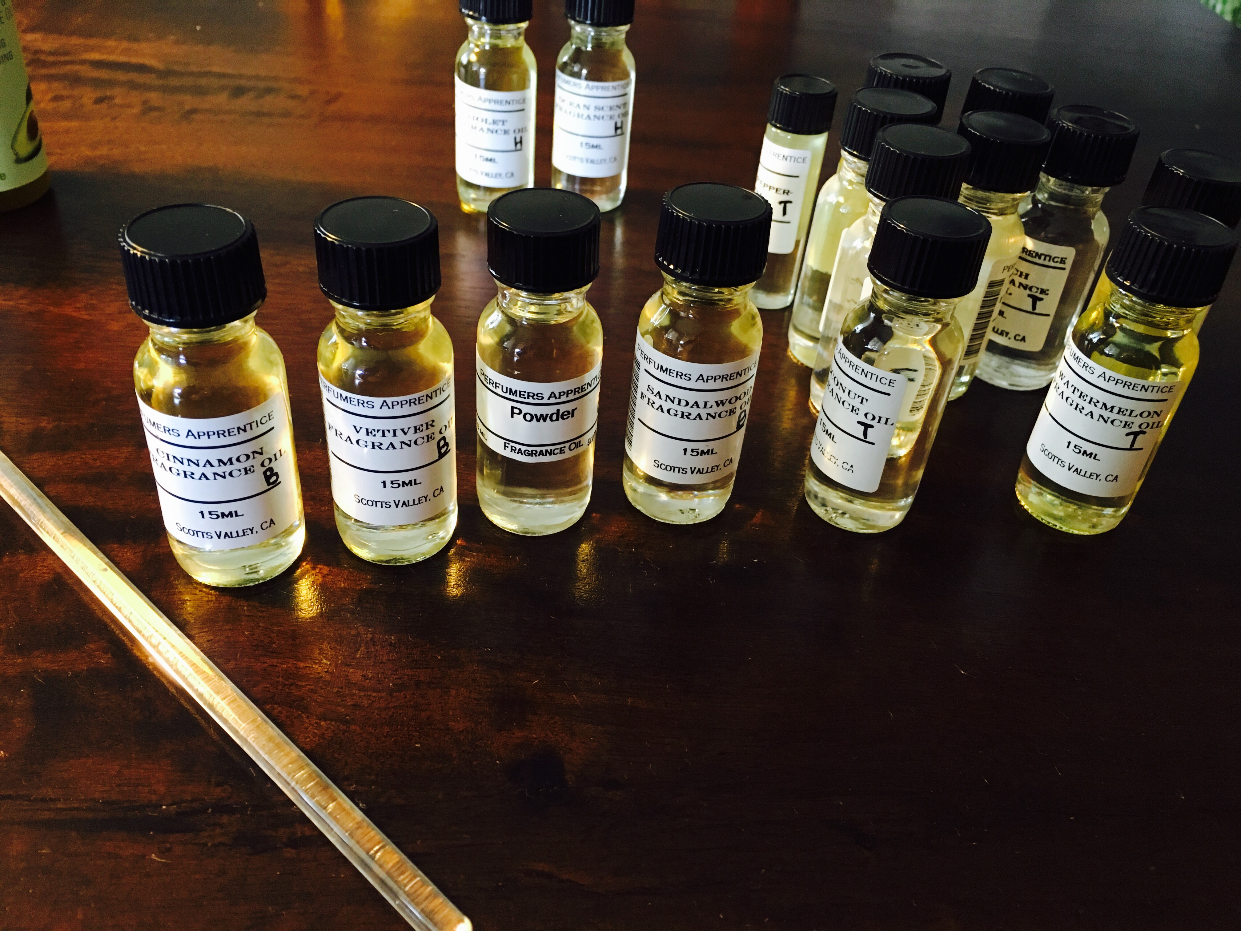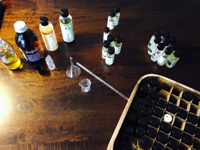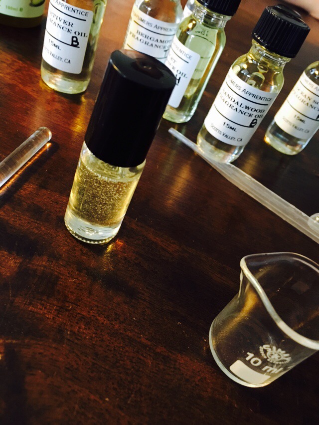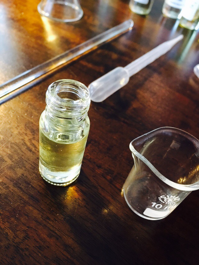 Sedan var det dags att testa sig fram i ca 100 doftoljor och färdigblandade s.k. key accords samt välja basolja (4 olika för att utesluta eventuella allergier).
