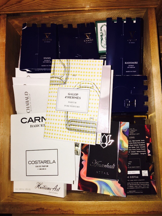 Inget i livet är gratis, det vet vi redan. Men när du köper något på olika butiker, både stationära och på nätet så får du ofta en eller flera små s.k. carded samples av aktuella dofter (som lanseras just nu, eller lanserades för inte så länge sedan). Vi har oftast inte så mycket att välja mellan. Detta kan hända om du köper något på de stora parfymerier eller parfymavdelningar (NK, Åhléns, Sephora, Kicks, Eleven osv.). Det är väldigt personlig grej om en säljare vill eller inte vill ge dig något extra. Vissa kedjor har tyvärr någon sorts policy, där personalen väljer ut kunder som ”förtjänar” produktprover. Idiotiskt, men sant. Jag som besöker parfymerier i jeans och trekkingskor ingår inte i den gruppen i deras ögon. Men vill ni testa något mer ingående, hemma i lugn och ro, så är det bara att fråga. Att fråga kostar inget – det värsta som kan hända är ett nej. Själv får jag sällan det jag verkligen vill ha (ovannämnd anledning plus att jag ändå inte vill ha femtioelfte prov på kitschiga Decadence från Marc Jacobs och det som jag vill ha har ni aldrig ens hört talas om. :P).