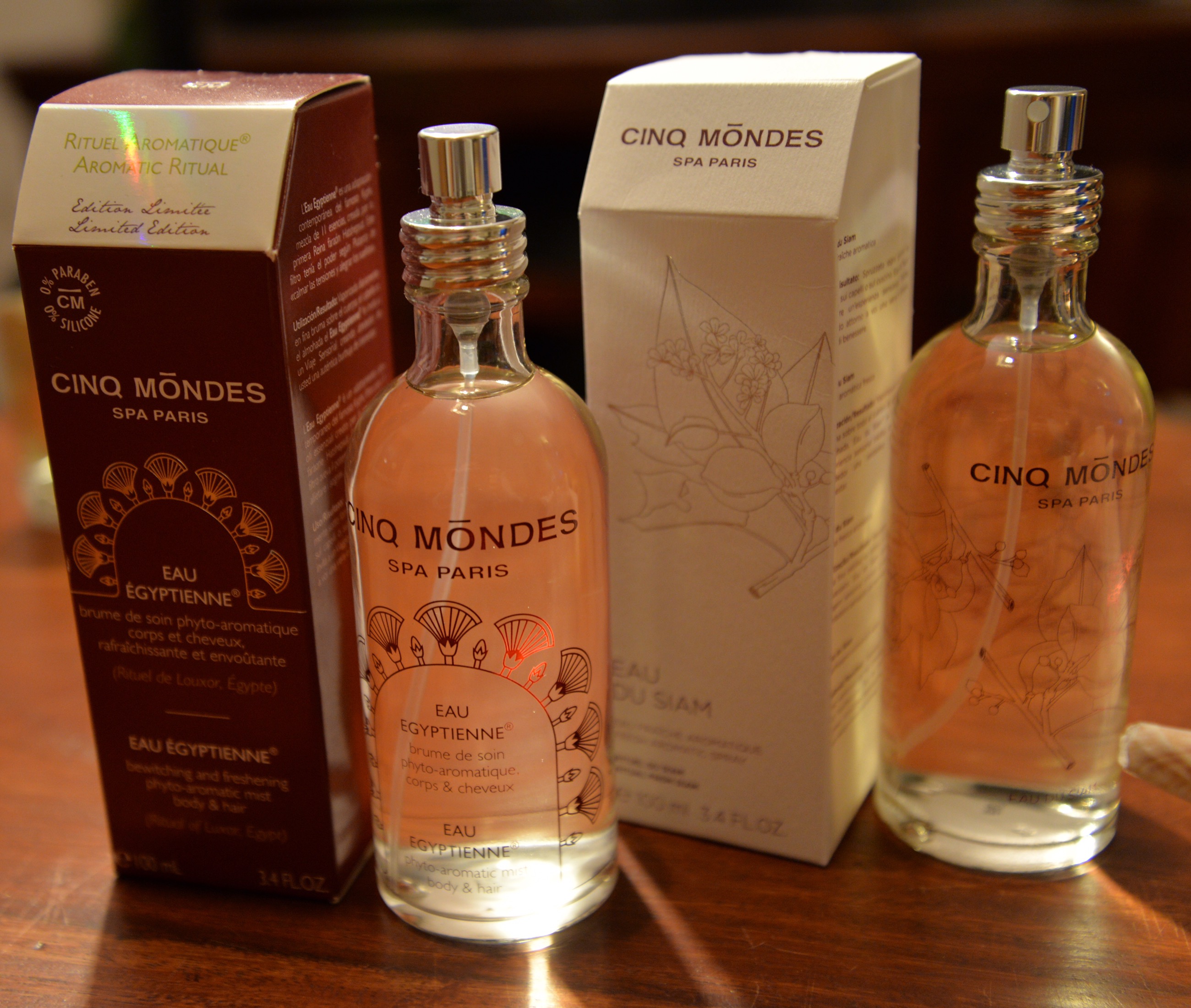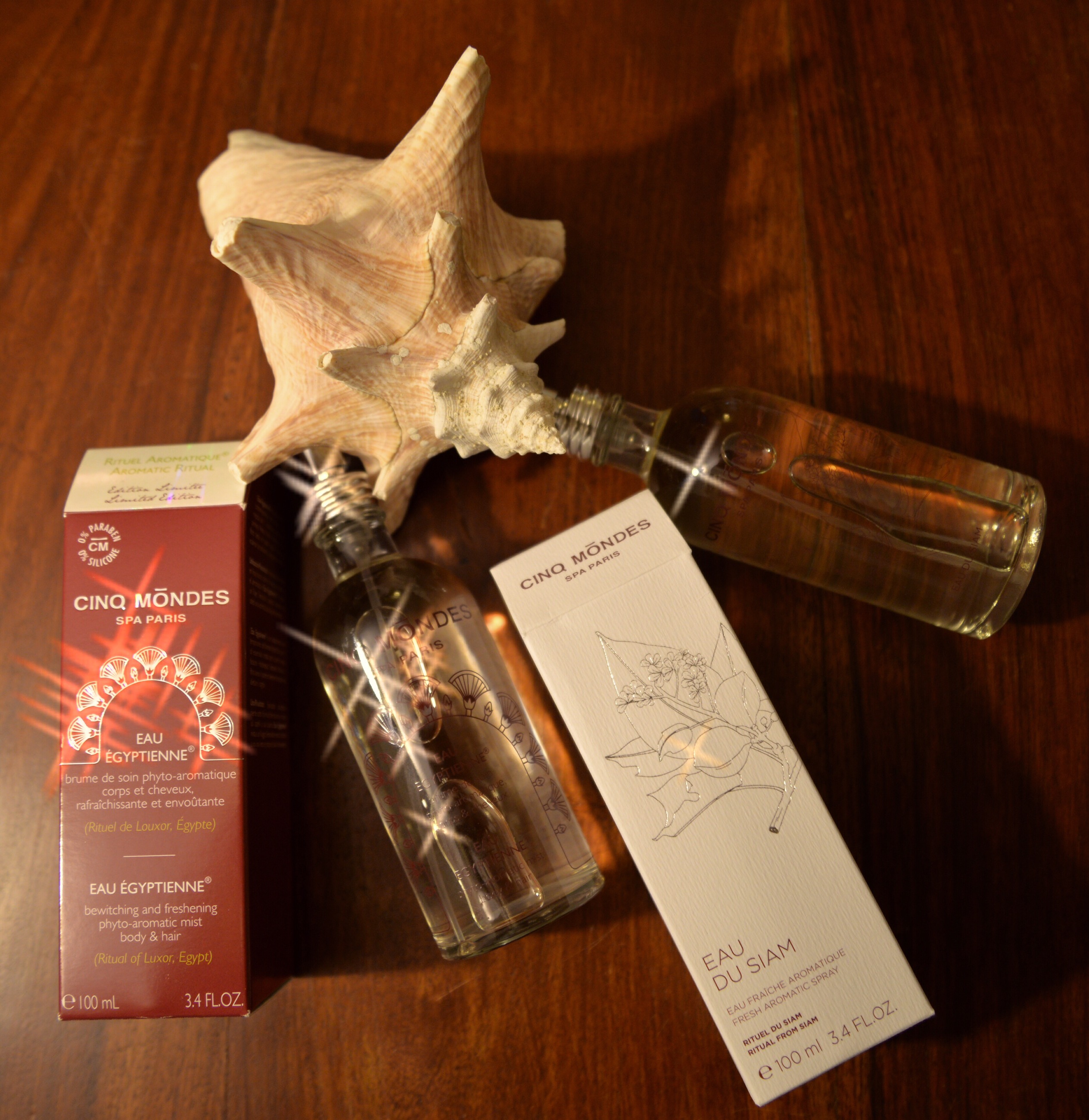 Vill du använda lättare varianter så välj gärna en av fytoaromatiska mistar från franska spamärket Cinq Mondes som jag fick känna på Daisy Beauty Expo och fick några arbetsprover – Eau de Siam passar som mest med sina uppfriskande noter av citron, citrongräs, bergamott, koriander, ingefära, kanel och peppar – detox i en väldoftande form! Eau Egyptienne från samma märke innehåller rökelse av den ”kalla”, fräscha sorten: olibanum (fräsch, kylande doft) och grekiska mastix, mynta, enbär, cypress, lotus och en hel del annat – men guu, så energigivande! Dessa mistar är skapade för att använda som en ritual, en avslutning på en spabehandling, men kan lika bra användas på kroppen, hår och även på sängkläderna (men då skulle jag rekommendera andra dofter, t.ex. sensuella Jardins de Carthage och supermysiga Eau de Bangalore). Dessa innehåller naturliga, organiska ingredienser och är skonsammare mot huden. Låg oljekoncentration påverkar dock hållbarheten, men i detta fall spelar det ingen roll för efter ett härligt pass på gymmet duschar man bort det ändå. Vill du förlänga den fräscha känslan så sprejar du igen och då håller den i ca 2,3 timmar.