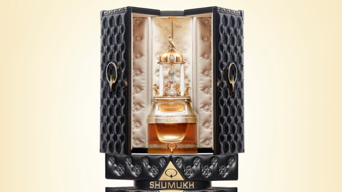 Flakongen i Murano-kristall är dekorerad med 2,5kg guld, nästan 6kg silver, 3571 diamanter och en del pärlor. Hästarna som pryder flakongen är i guld, ostronen är i silver och pärlor. Shumukh har slagit två Guinessrekord – en för mest diamanter på en parfymflaska och en för den längsta fjärrstyrda parfymflaskan i världen. (Insert your own thoughts here). För det är inte bara en flakong, det är ett helt skåp på 2 meter som öppnar sig, justerar sprayern och sprayar på personen som står framför det.