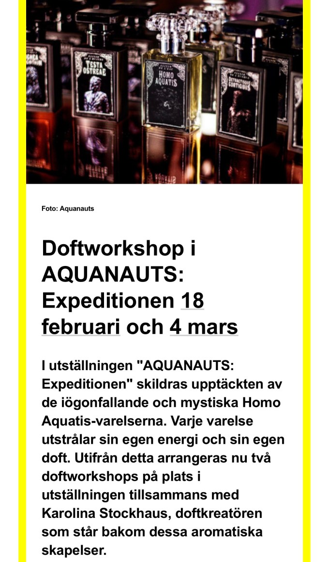 Vi börjar med workshop/seminarium om Aquanautsdofter på Kulturhuset Stadsteatern den 18e februari kl.18.00 – 19.30.